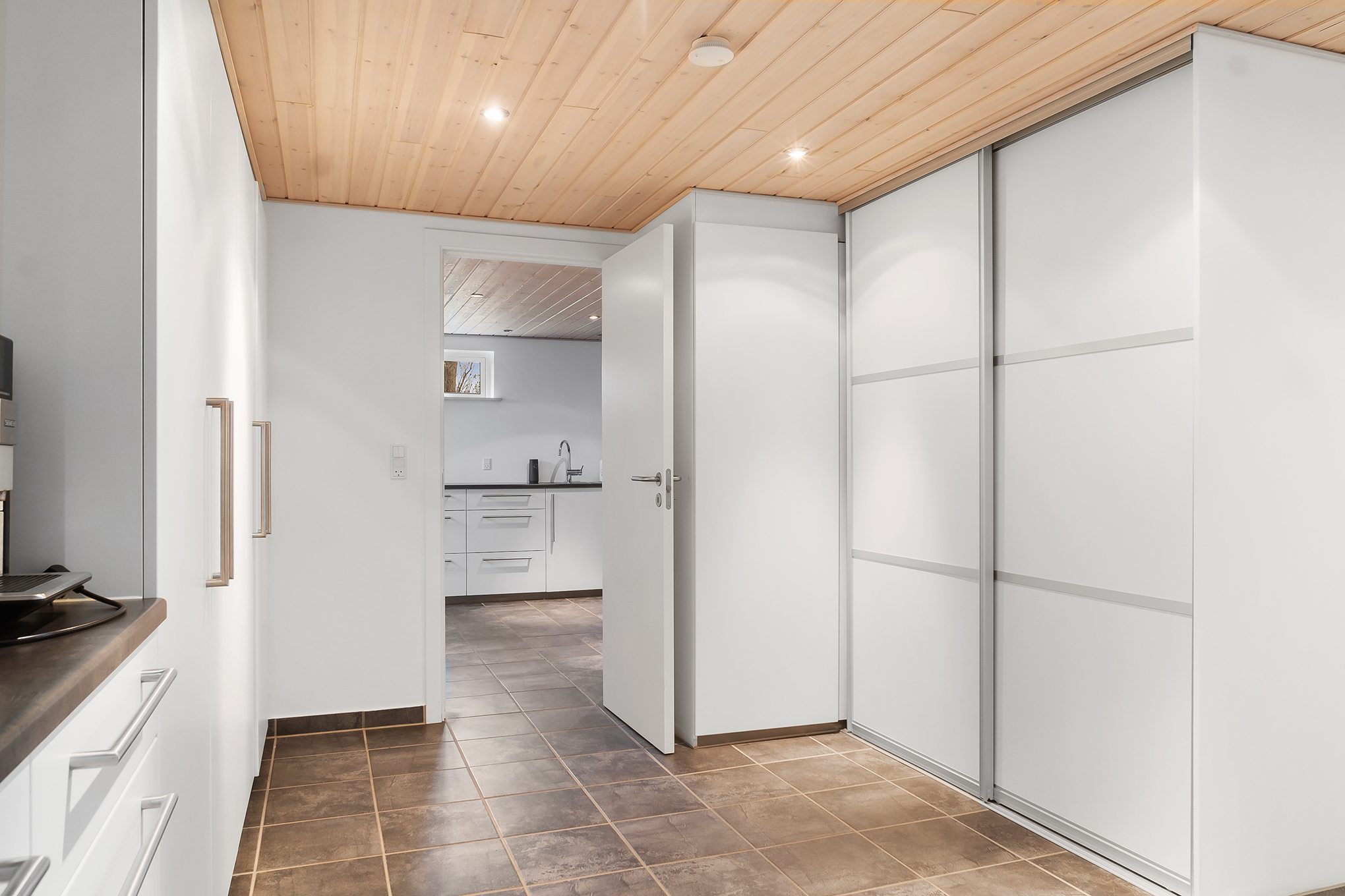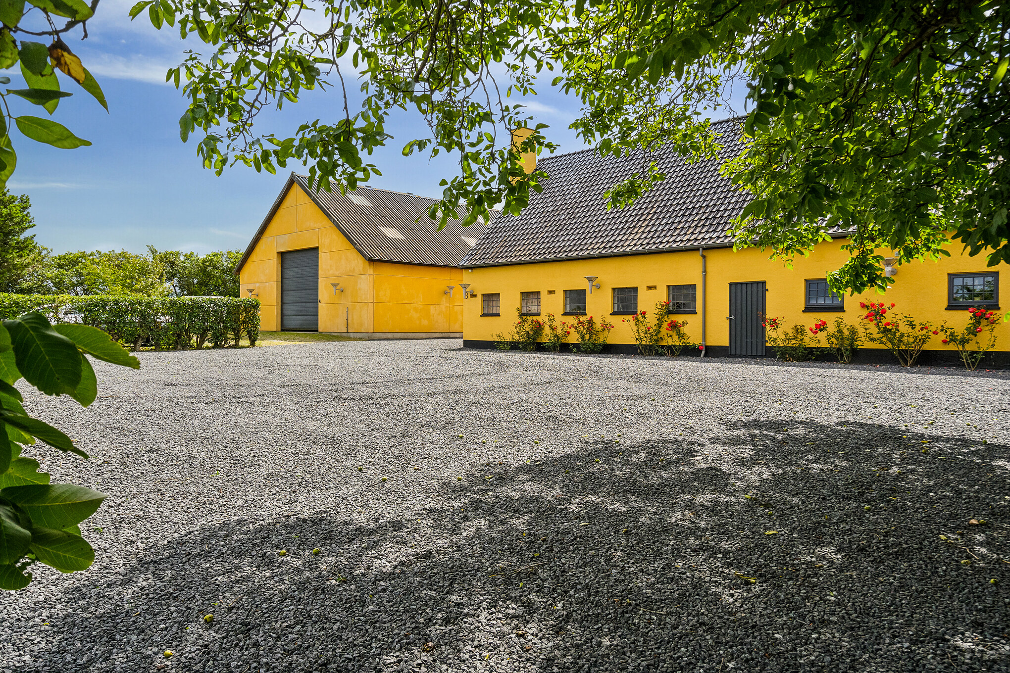 Stueetagen er indrettet med stort køkken-alrum på ca. 50 kvm. Her er alt hvad et moderne køkken bør indeholde og designet er enkelt og tidløst. Mod vest er der udgang til en lukket terrasse med kik ned over markerne mod Lillebælt. Mod syd er der i stueetagen indrettet en stor og meget lys stue (ca. 50 kvm) med høje vinduespartier mod syd og vest samt udgang til haven. Ud over soveværelse og ekstra badeværelse findes der i stueetagen direkte indgang til driftslængen. Her er flere rum indrettet med muligheder for kontor, klinik eller anden form for erhverv. Måske har man en pladskrævende hobby eller andet, hvor det er praktisk at ha’ direkte adgang fra privatboligen samtidig med, at der hurtigt og let kan lukkes af. Det samlede areal af denne del af driftslængen er på 61 kvm og der er naturligvis indlagt fiber til lynhurtigt internet.