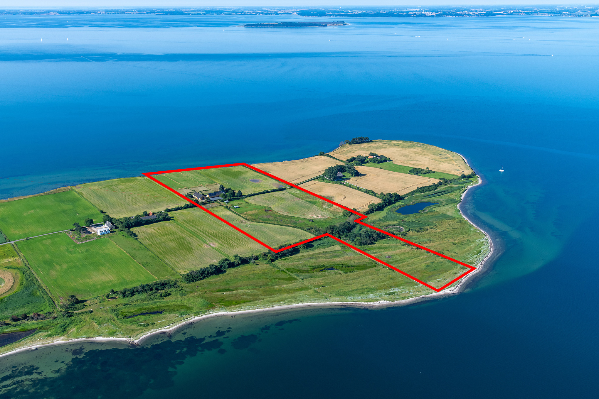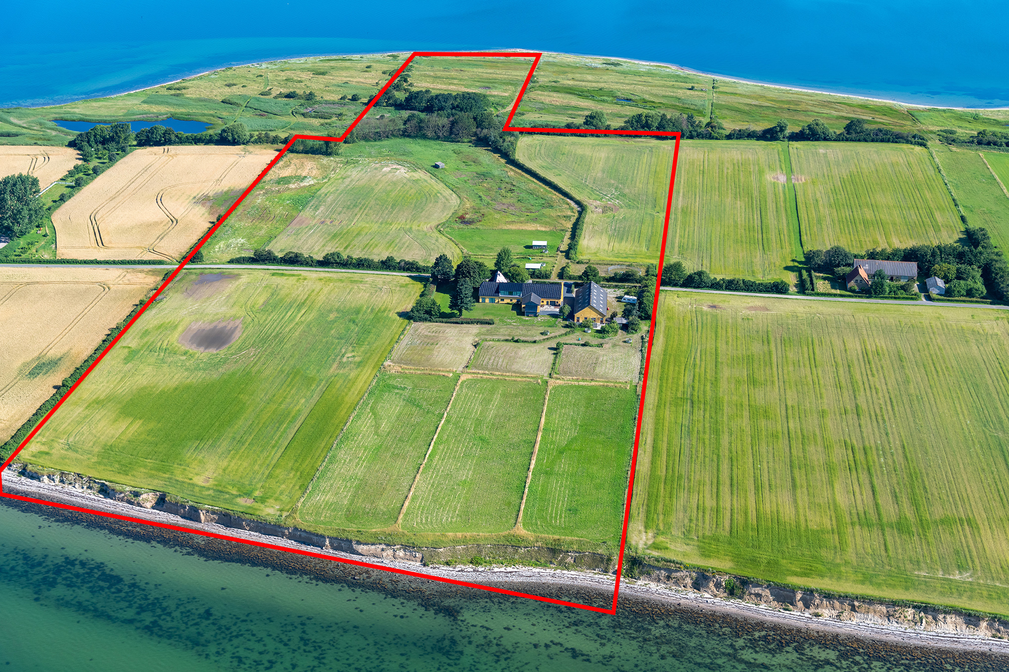 Helt unik beliggenhed på halvø direkte til Lillebælt, lige syd for Føns og kun ca. 10 km fra den fynske motorvej ved Nørre Aaby. Jordstykket på knap 11 ha ligger i ét samlet stykke rundt om ejendommen og på tværs af halvøen således, at der til ejendommen hører strandgrund både mod nord og mod syd. Rudvej slutter ca. 300 m efter ejendommen, hvor der findes 2 naboejendomme – så trafikken er meget begrænset, og vejen også ganske smal. Her er der fred og idyl – og ikke mindst – frisk havluft alle dage. Uanset hvilken retning vinden blæser, fornemmer man den friske salte havluft direkte fra det smukkeste farvand vi finder i Danmark.