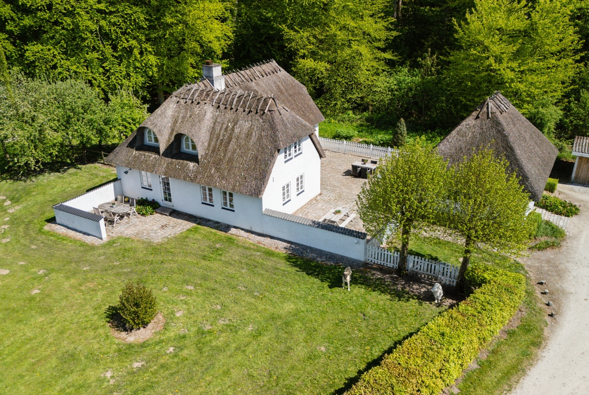Fantastisk smuk og idyllisk beliggenhed med et rigtigt hyggeligt fuldmuret hus med stråtag på 215 kvm i 2 plan + 20 kvm kælder. I forbindelse med huset er opført et muret stråtækket udhus på 49 kvm (tidligere garage), og en hyggelig brostensbelagt gårdsplads binder de 2 bygninger sammen i et solrigt område med masser af læ og direkte udsyn til både skoven og til markerne.