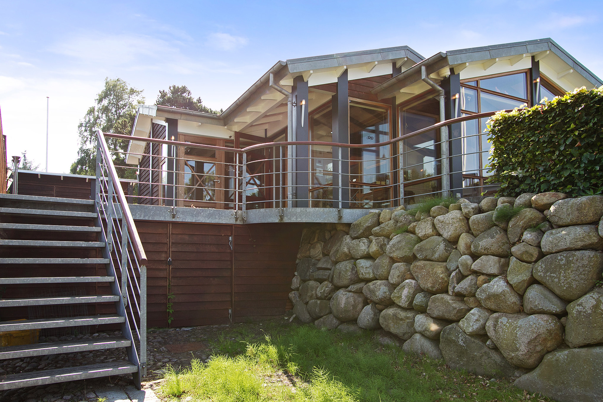 En flot dobbelt smedejerns låge byder velkommen til ejendommen – flot udsmykket med motiver af sejlskibe, så den maritime stil lige som er lagt. En smuk stensætning afgrænser indkørslen og en trappe udført i maghoni fører op til huset. Trappegelænderet er udført i rustfrit stål og maghoni, ligesom hele den næsten 80 kvm store træterrasse også er udført i maghoni.