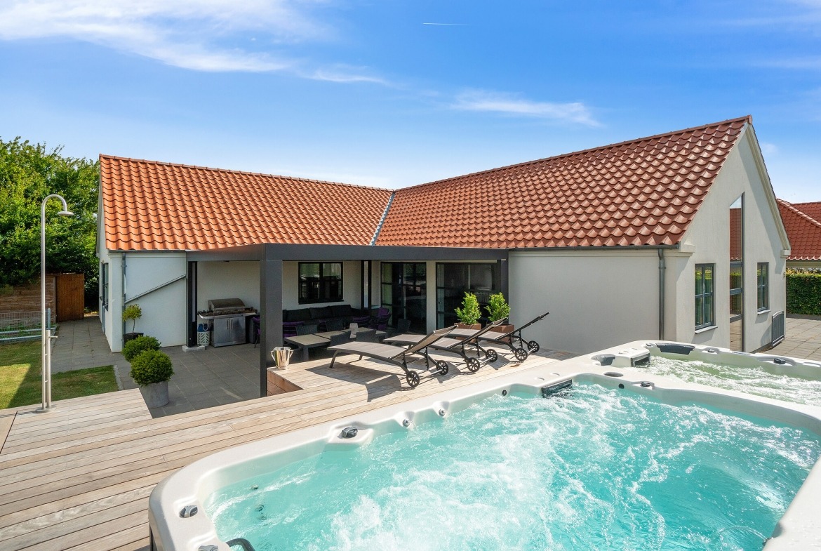 Villaen henvender sig til den kvalitetsbevidste familie, som ønsker eksklusive faciliteter og indretning. Her kan nævnes et fantastisk udemiljø med en stor træterrasse, hvor der er installeret et varmtvandsbassin, et mindre spabad samt varmvandsbruser. Bassinet holder 26 grader hele året rundt, så der er mulighed for at svømme mange baner mod strømmen alle årets 365 dage. Efter en skøn svømmetur kan man nyde resten af dagen og aftenen på den store overdækkede terrasse på hele 30 kvm.