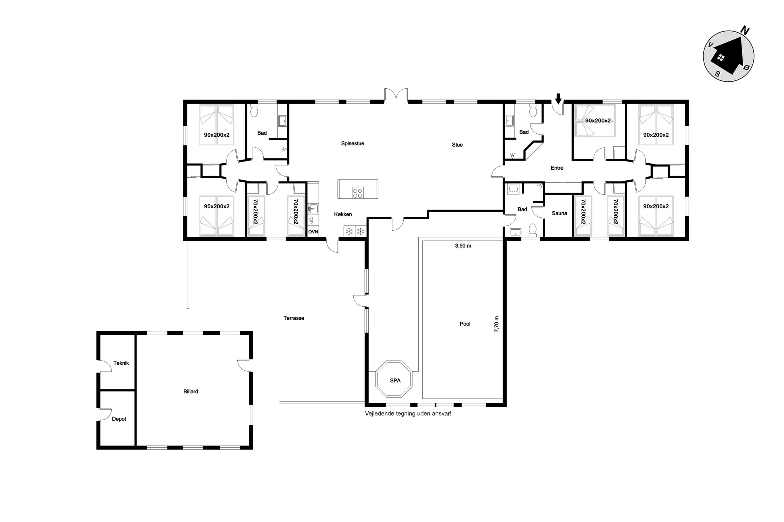 5 værelser er indrettet som dobbeltværelser, og de sidste 2 værelser har hver 4 køjesenge. Hertil hører der 3 badeværelser – ét i pool området og ét i hvert værelsesafsnit. Den store lukkede terrasse er sammenbygget medet anneks på 50 kvm, hvor der er indrettet et stort aktivitetsrum med billard, bordtennis m.v. Alt i alt et rigtigt hyggeligt hus med masser af atmosfære, og som samtidig kan rumme hele den store familie – og så har der i 2025 været leje- og forbrugsindtægter for kr. 472.000 til ejeren.