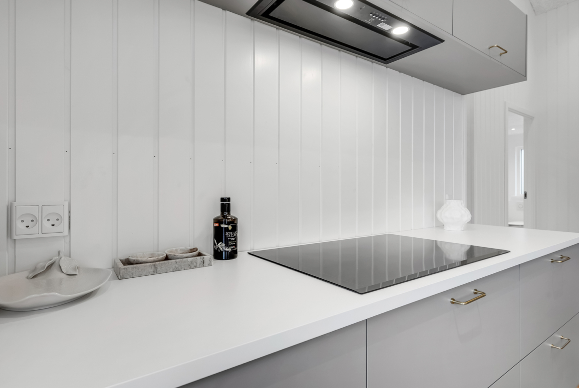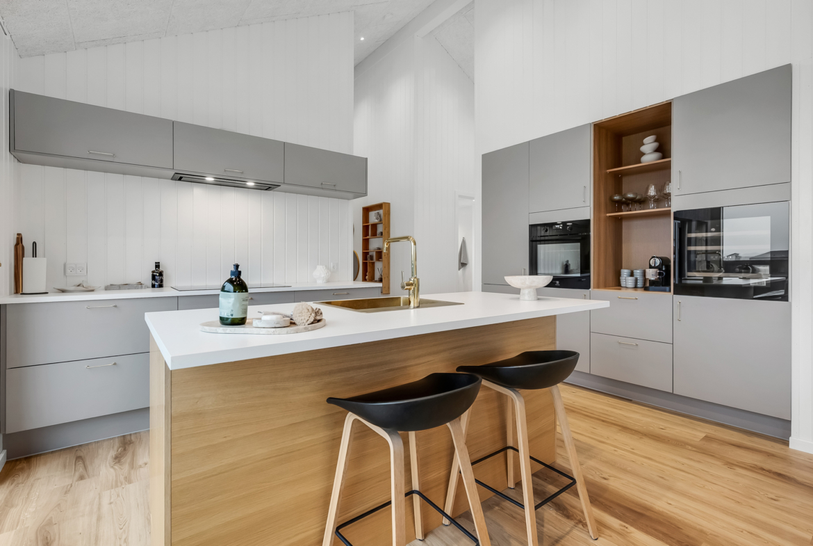 På samme måde er indgangspartiet til huset forsynet med to døre. Den ene er med adgang til selve entréen / garderoben – den anden er monteret i en lige linje mellem den udendørs sauna og den indendørs spa. En lille praktisk løsning, der gør adgangen mellem de to wellness afdelinger lettere og samtidig tilgodeser renholdelsen af huset. På den måde kan fritiden nydes i fulde drag. Køkkenet er indrettet mhp. at flere arbejder sammen omkring gastronomien. Vinskabet er placeret mod stuen og spiseafdelingen, cappuccinomaskinen kan benyttes uden at forstyrre de arbejdende i køkkenet, vask og komfur er hver især placeret på separate køkkenborde, så der er rigelig med bordplads at arbejde ved.