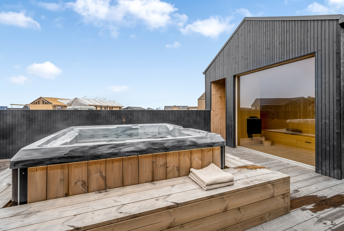 Super flot, velbygget og moderne luksussommerhus med et boligareal på 155 kvm + overdækkede arealer på 21 kvm og udhuse på samlet 25 kvm. Herudover er huset forsynet med en ugeneret træterrasse på ca. 100 kvm, der er omkranset af et solidt plankeværk og integreret med de overdækkede arealer ved husets indgangsparti og på grillpladsen / terrassen ud for stuen. Et udhus på 18 kvm incl. sauna og udendørs bruseniche er med til at gøre terrassen endnu mere ugeneret, hvilket er udnyttet ved et stort glasparti på fronten af saunaen. Den således visuelt åbne sauna bliver på den måde en del af terrassen kombineret med en stor udendørs spa, som er placeret i sammenhæng med saunabygningen. Træterrassen er herudover ført helt ud til husets indkørsel – naturligvis med tanke på let renholdelse af huset. Her drejer det sig nemlig kun om at slappe af og nyde tilværelsen.