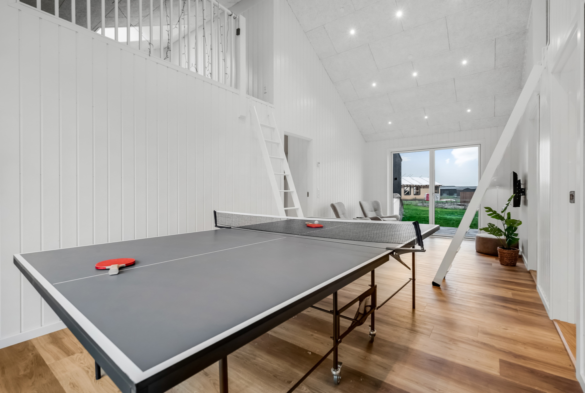 Mht. indretning af huset, har arkitekten lagt vægt på både funktionalitet, design og en daglig anvendelse af hele familien på samme tid. Aktivitetsrummet er placeret i modsatte ende af huset i forhold til stuen, hvor der slappes af og hvor der er udgange til terrasse og overdækket grill-afdeling. Børnenes legehemse er naturligt indrettede i sammenhæng med aktivitetsrummet, og i samme afdeling findes 2 værelser med hhv. 2 og 3 senge. Mellem værelserne er indrettet et badeværelse, der naturligt hører til de to værelser. Badeværelset er endvidere indrettet med dør direkte til den del af træterrassen, som vender mod indkørslen. Tanken er at kunne anvende badeværelset uden at skulle gennem huset, hvis strandturen netop er afsluttet og sand m.v. skal skylles væk. Herudover er der lagt vægt på den lette indretning af badeværelserne – både visuelt men også mht. renholdelse. Toiletter er væghængte og håndvaskeborde / skabe er ligeledes hævet over gulvet uden støtteben. Renholdelsen er dermed gjort så enkel som det kan lade sig gøre.