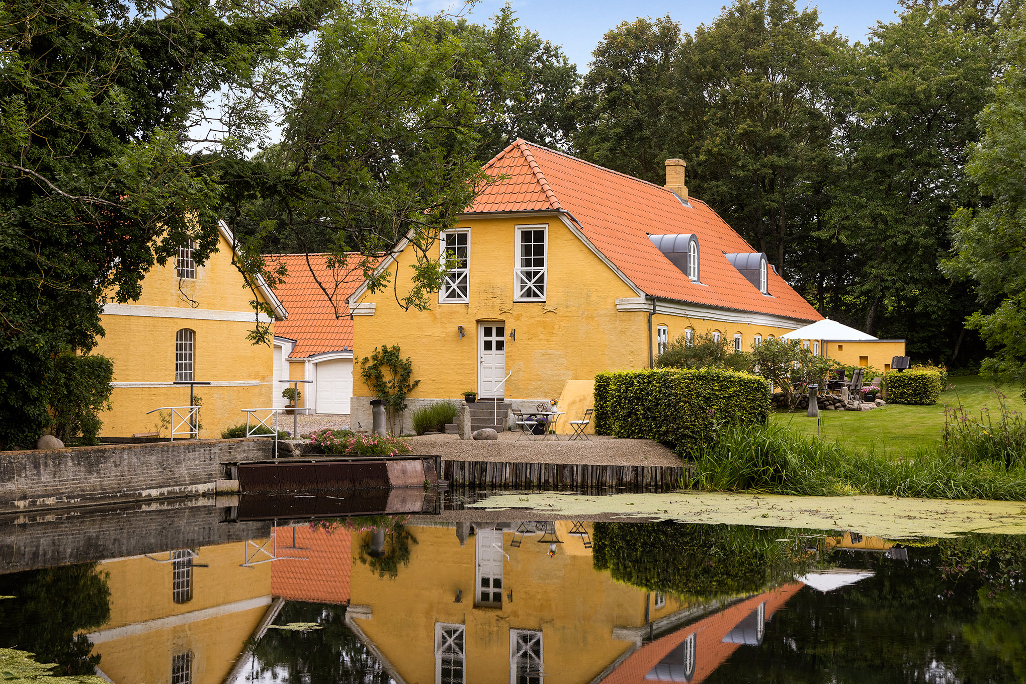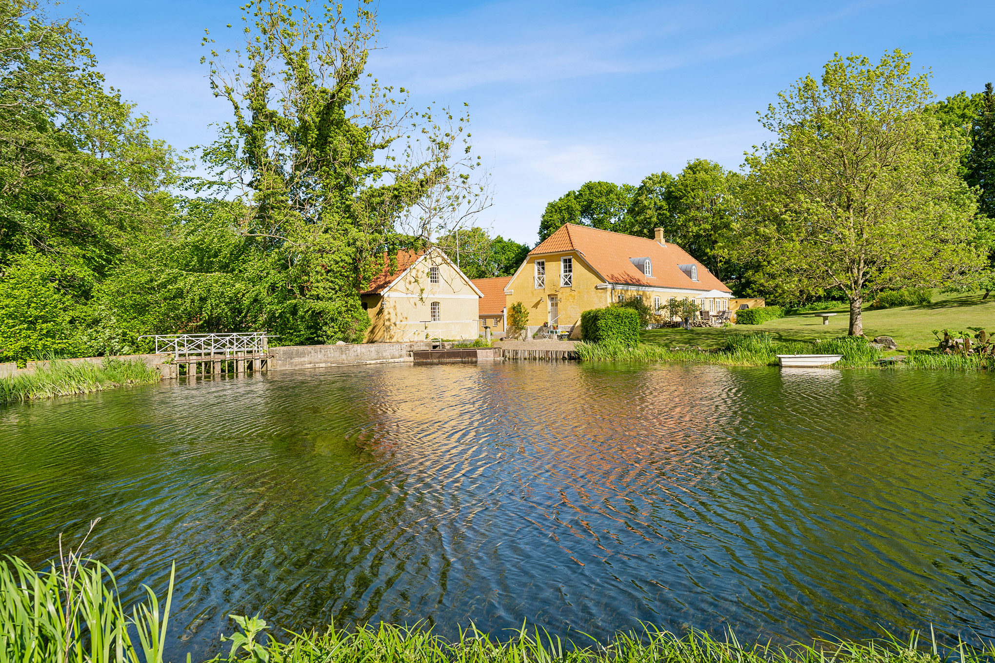 Hovedhuset på 290 kvm er opført i 1880 og fremstår med et pænt og velholdt tegltag fra 1994. De fleste af husets vinduer er blevet skiftet til træ/alu med lavenergi glas i 2016. Kvistvinduer er udført med flotte buer og zinkinddækninger, og alt er i det hele taget afstemt i smuk harmoni med husets stil og alder. Gårdspladsen er smukt belagt med toppede brosten, og den store trappe til husets indgang er udført i flotte store granitsten der fuldender stilen på bygningen. Indvendigt fremtræder alt i flot og meget velvedligeholdt stand og ny ejer kan således rykke direkte ind. Bag huset er der med udgang fra både stue, køkken og køkken/alrum anlagt en stor terrasse, hvorfra der er udsigt direkte til møllesøen – ca. 10-15 m afstand. Kun få meter fra huset findes en lille bro med stemmeværk for møllesøen, og man kan herfra følge en sti rundt om hele søen. Det er også muligt, at glide stille hen over søen i en lille robåd og blot lytte til naturen. I den store, dejlige have er der æble- og kirsebærtræer og nøddehegn, og der kan altid findes læ på et af de mange hyggelige steder.